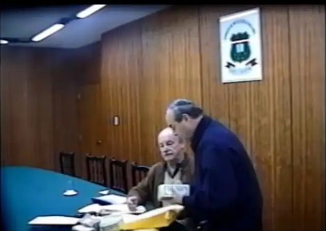 El fujicandidato. Montesinos entregando dinero al candidato fujimorista a la alcaldía de Lima, Juan Carlos Hurtado Miller, en las oficinas del SIN.